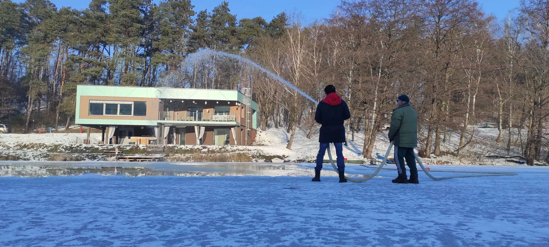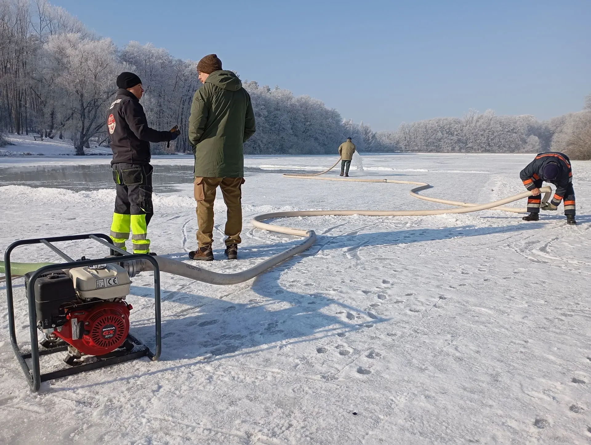 Jégpálya készül a Nyírjesben: 2026. január 20-án és 21-én a téli sportok kedvelőinek igyekeztünk örömet szerezni. A Nyírjesi-tó vastag jegét egy civil kezdeményezés keretében segítettünk előkészíteni a sportoláshoz: a hótól megtisztított területet vízzel árasztottuk el, hogy tökéletes, sima jégfelület várja majd a korcsolyázókat.