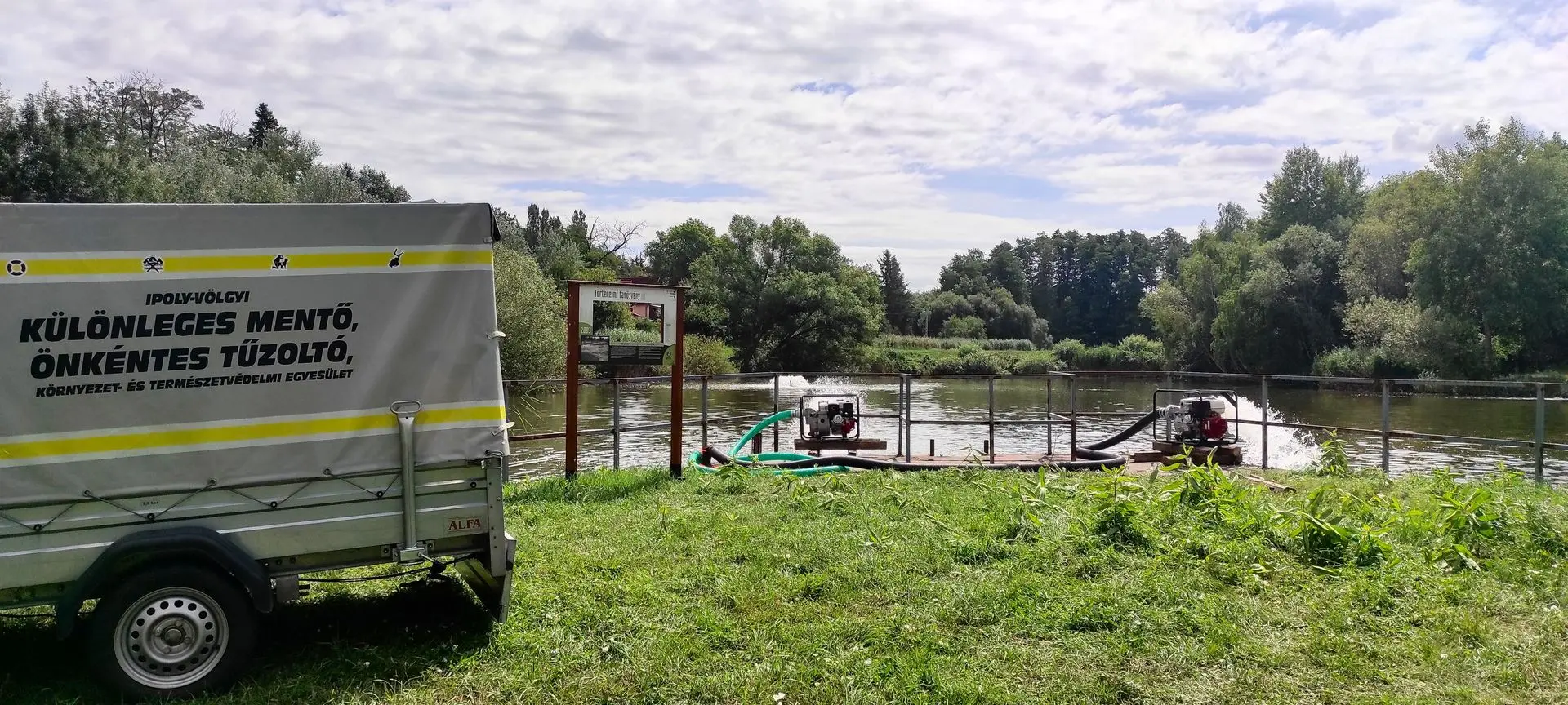 Két nagy teljesítményű szivattyúval siettünk a helyszínre, ahol az elmúlt napokban a horgászegyesület és a Nógrádmarcali Önkéntes Tűzoltók munkáját óránként mintegy 180 köbméter víz forgatásával igyekeztünk segíteni.